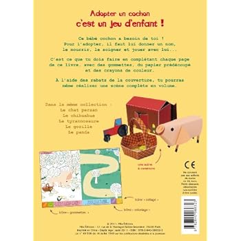 Adopter un cochon c'est un jeu d'enfant ! Ce bébé cochon a besoin de toi ! Pour l'adopter, il faut lui donner un nom, le nourrir, le soigner et jouer avec lui... C'est ce que tu dois faire en complétant chaque page de ce livre, avec des gommettes, du papier prédécoupé et des crayons de couleur. A l'aide des rabats de la couverture, tu pourras même réaliser une scène complète en volume.