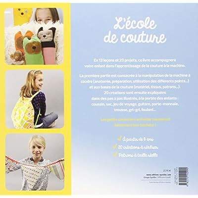 Destiné aux enfants à partir de 8-10 ans, cet ouvrage les accompagnera dans l'apprentissage de la couture en 13 leçons et 20 projets. 4 planches de patrons à taille réelle sont glissées dans une pochette en fin d'ouvrage. La première partie du livre est consacrée à la manipulation de la machine à coudre, depuis son anatomie et sa préparation jusqu'à l'utilisation des différents points. Les auteurs expliquent aussi comment se servir d'un patron, rembourrer un objet, etc. 20 créations sont ensuite expliquées dans des pas à pas largement illustrés : coussin, sac, jeu de voyage, guitare, porte-monnaie, trousse, foulard...
